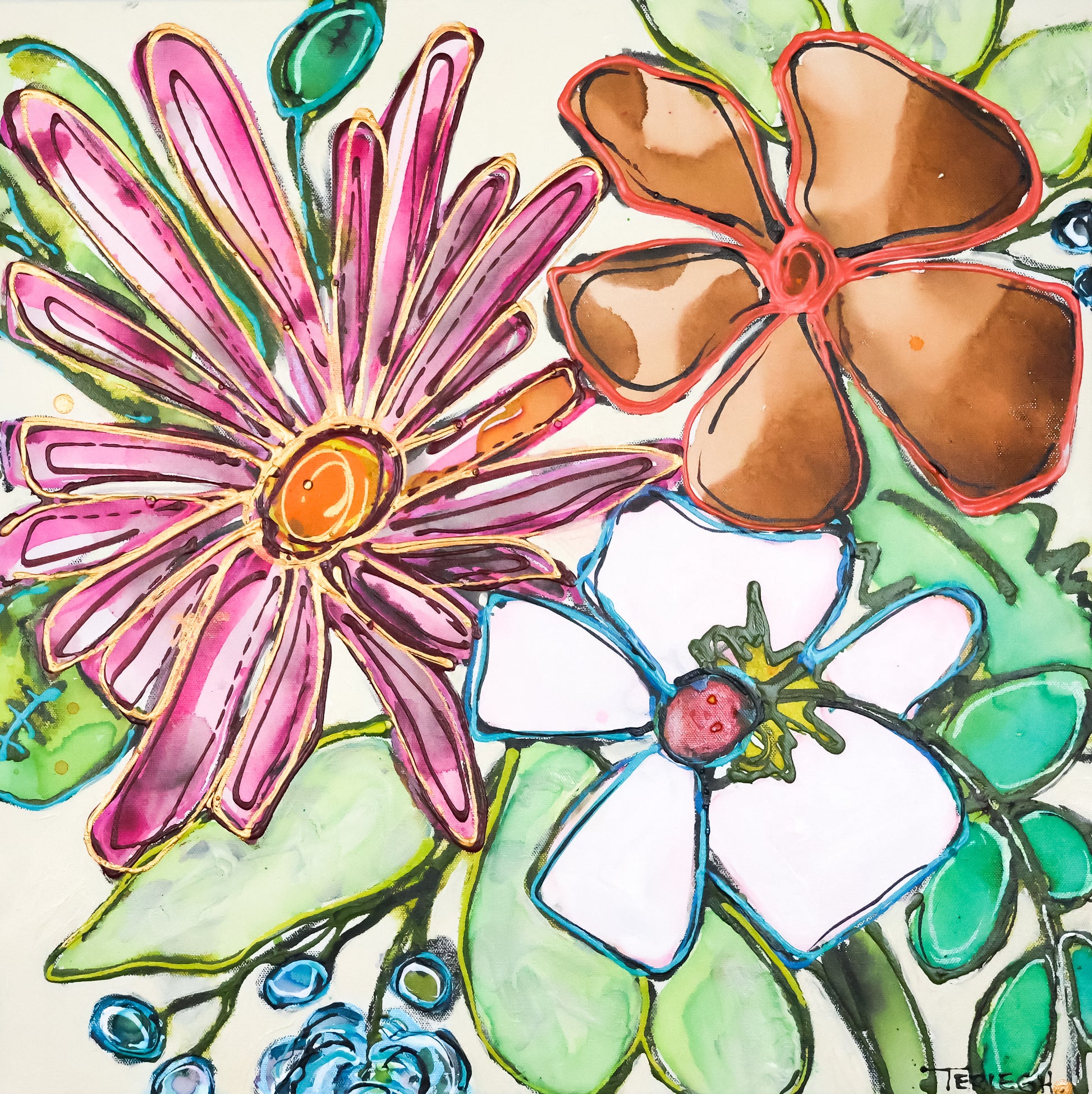 Created using mixed media of acrylic paints, inks, and a variety of mark-making supplies. This painting has been sealed with a UV satin varnish for protection leaving a nice sheen without being too glossy.