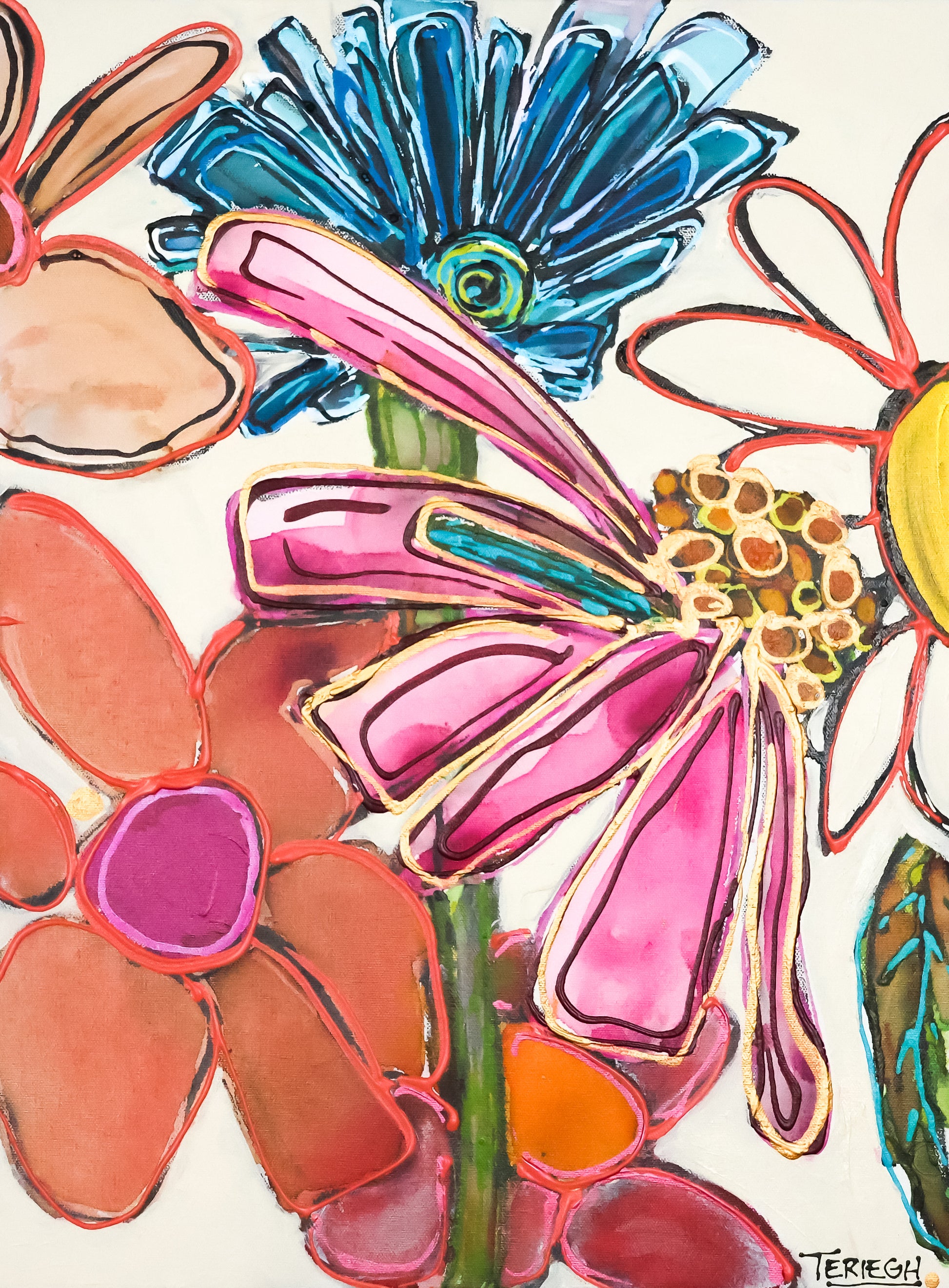 Created using mixed media of acrylic paints, inks, and a variety of mark-making supplies. This painting has been sealed with a UV satin varnish for protection leaving a nice sheen without being too glossy.