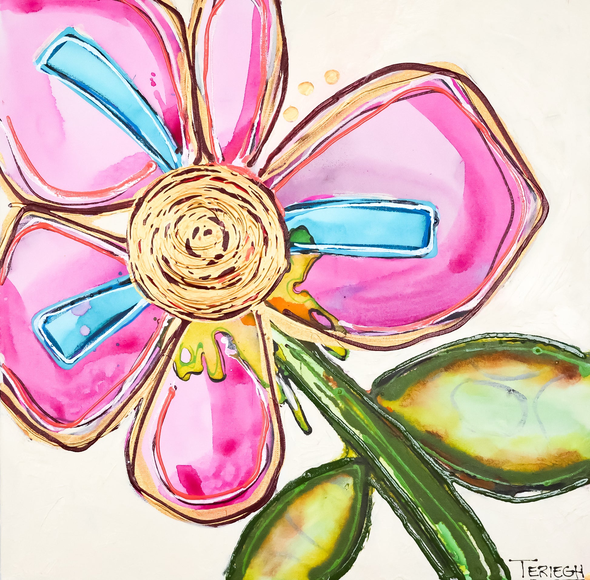 Created using mixed media of acrylic paints, inks, and a variety of mark-making supplies. This painting has been sealed with a UV satin varnish for protection leaving a nice sheen without being too glossy.